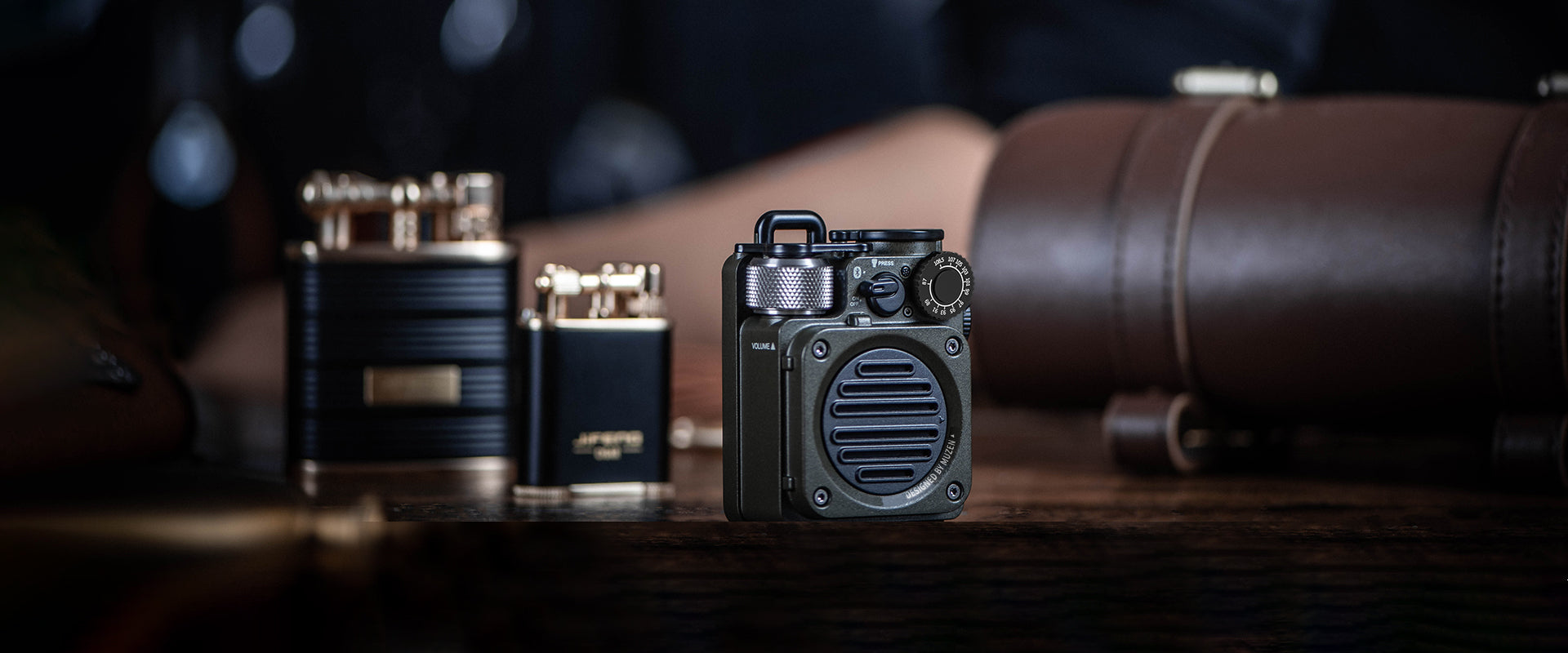 The Wild Mini, a standout among portable Bluetooth speakers, is specifically tailored for outdoor use, setting it apart from other outdoor waterproof speakers. Its military-inspired design, featuring a full-metal, zinc-alloy body, is built to withstand harsh conditions.